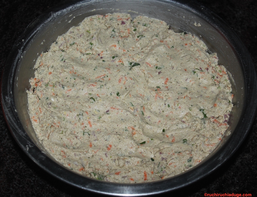 Add rice flour, chopped onion, grated carrot and mix them well.