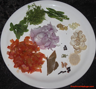Put 2 tsp ghee in a pan and heat. Add all dry ingredients and fry them in low/medium flame for about 2 mins. Add chopped ginger, garlic and fry them for 1-2 mins. Add chopped green chillies, coriander leaves, mint leaves, onion and fry them for about 2 mins. Add chopped tomato and fry them for about 3-4 mins until they give nice aroma.