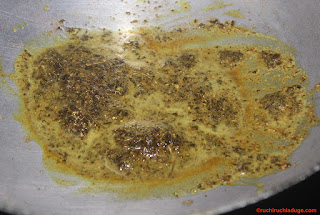Put 2 tsp ghee in a heavy bottomed vessel and heat.Add fenugreek leaves, 1/4 tsp turmeric powder, coriander powder, cumin seed powder and fry them in low flame for about 1 min.