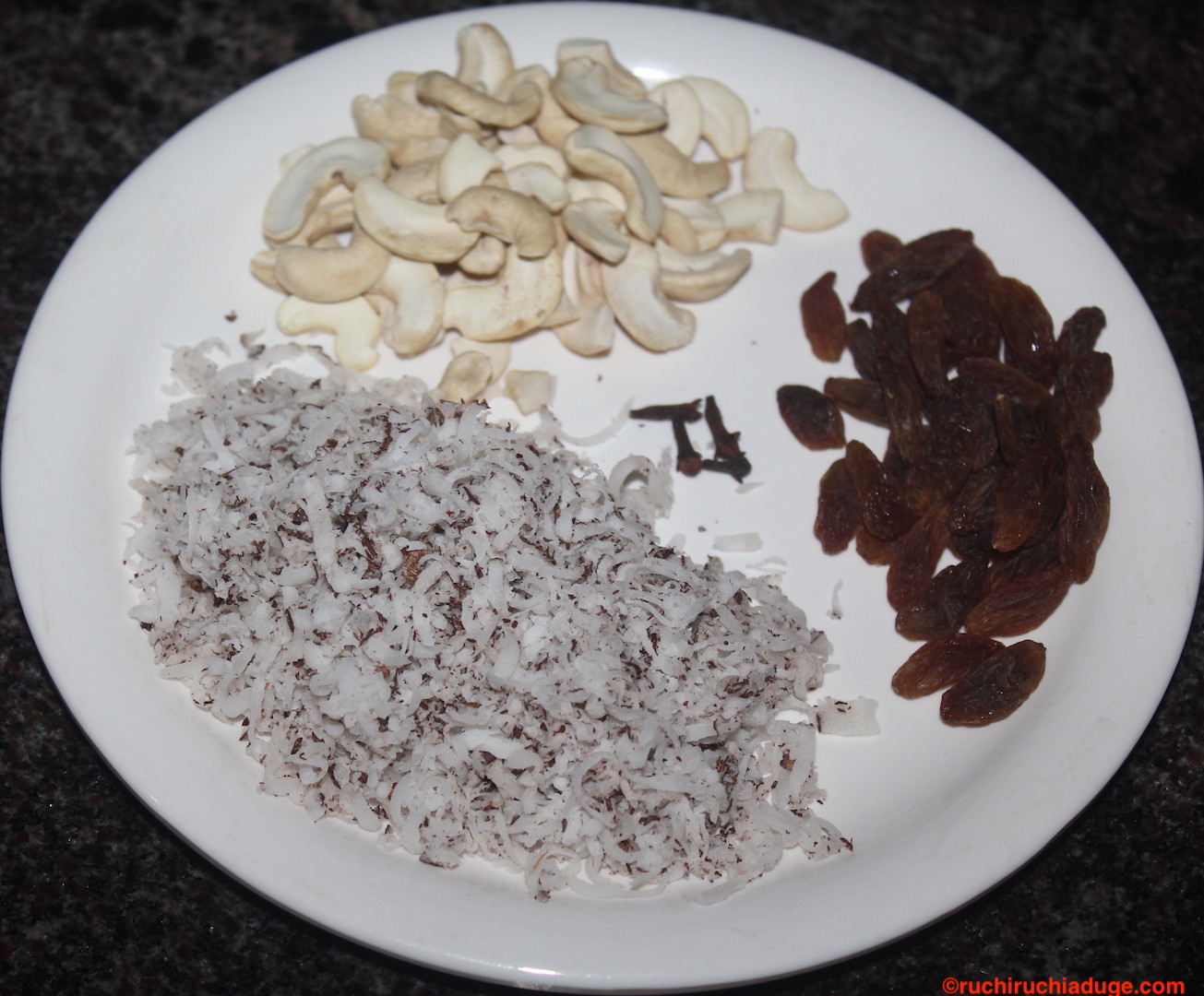 Put 1 tsp ghee in a thick bottomed vessel and heat. Add cloves, cashew nuts, raisins and fry them in low flame until cashew nuts turn light golden in colour.
